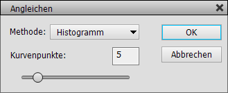 Die Schaltfläche Angleichen zeigt einen Dialog zum Auführen verschiedener Arten von Histogrammangleichungen an. Der Menüeintrag Filter > Anpassungsfilter > Tonwertangleichung, der etwas Ähnliches macht, wendet den Effekt an, ohne die Möglichkeit, diesen anzupassen. Die Angleichen-Funktion im Gradationskurven-Dialog erstellt eine Kurve, die den Effekt reproduziert. Auf diese Weise können Sie die Kurve anpassen, um den Effekt je nach Ihrem Geschmack zu bearbeiten. Die Angleichen-Funktion wird auf den aktuell ausgewählten Kanal angewendet. Sie funktioniert am besten mit Luminanzkanälen wie RGB, L oder Y.