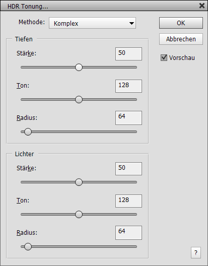 HDR Tonung ermöglicht, die Tiefen- und Lichtertöne zu komprimieren, um einen HDR-ähnliches Aussehen zu produzieren. Dieser Filter ähnelt dem Tiefen/Lichter-Dialog, erzielt aber einen natürlicher wirkenden Effekt. Die Einfach-Modus bietet weniger Regler und wird schneller berechnet als der Komplex-Modus, welcher mehr Regler für separate Tiefen- und Lichteranpassungen bietet. Beide Modi verwenden individuelle Reglerwerte, somit werden beim Wechsel zum anderen Modus nicht die Reglerwerte des vorhergehenden Modus übernommen.
