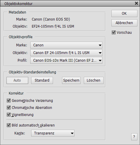Der Menüpunkt Vollständige Objektivkorrektur entfernt die geometrische Verzerrung, chromatische Aberration und Vignettierung. Wenn Sie nur eines davon anwenden möchten, verwenden Sie bitte die Menüpunkte Nur Geometrische Verzerrung, Nur chromatische Aberration oder Nur Vignette. Während der Berechnung können Sie das verwendete Objektivprofil im Verlaufsfenster sehen.