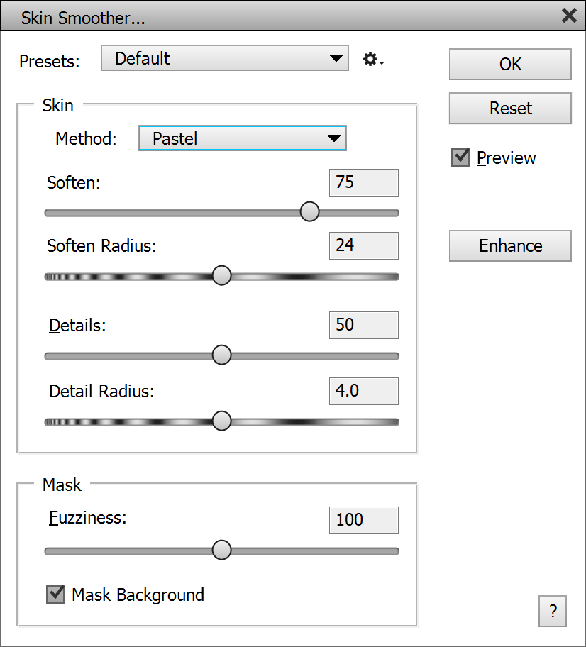Das Kombinationsfeld Methode bietet Pastell-, Weich- und Schein-Methoden. Die Pastellmethode ähnelt der Deckcreme eines Make-up Kits. Es entfernt Hautdetails und erzeugt ein mattes Aussehen. Die Weich-Methode erzeugt einen weicheren Effekt und lässt die Haut strahlen. Die Schein-Methode ist am wenigsten aggressiv, behält die meisten Hautdetails bei, sieht aber möglicherweise auch weniger natürlich aus als die anderen. Verwenden Sie nicht zu hohen Einstellungswerte, sonst wird ein unnatürlicher Look erzeugt.