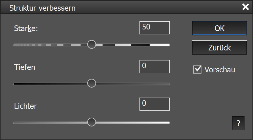 Der Filter Struktur verbessern reproduziert den aus Adobe Camera Raw bekannten Struktureffekt. Es erhöht den Kontrast in Bilddetails ähnlich dem Mikro-Kontrast-Effekt, erzeugt aber ein anderes Aussehen. Mit den Reglern für Tiefen und Lichter können Sie den Effekt in den dunklen und hellen Bildbereichen verringern oder verstärken.