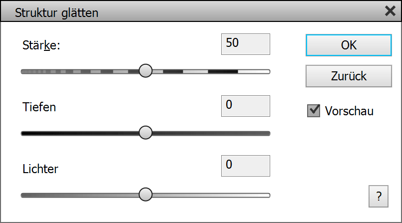 Der Filter Struktur glätten reproduziert den aus Adobe Camera Raw bekannten Struktureffekt. Es glättet Oberflächen in Bildern und entfernt Rauschen und Texturen. Mit den Reglern für Tiefen und Lichter können Sie den Effekt in den dunklen und hellen Bildbereichen verringern oder verstärken.