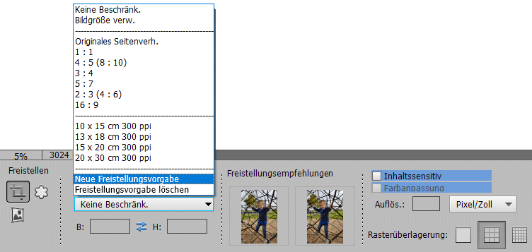 Das neue Vorgabenkombinationsfeld bietet verschiedene Vorgaben und ermöglicht auch eigenen Freistellungsvorgaben zu speichern und zu löschen. Der Punkt Keine Beschränk. erlaubt Ihnen, einen Freistellungsrahmen auf dem Bild ohne Einschränkungen zu zeichnen. Der Punkt Bildgröße verw. füllt die Textboxen B(reite) und H(öhe) mit der aktuellen Bildgröße, so dass der freigestellte Bereich auf die ursprüngliche Pixelabmessung vergrößert wird. Der Punkt Originales Seitenverh. zeigt einen Freistellungsrahmen an und arretiert dessen Seitenverhältnis um sicher zu stellen, dass das beschnittene Bild die gleichen Proportionen wie das ursprüngliche Bild hat. Die nächsten sechs Kombinationsfeldeinträge bieten Seitenverhältnisse und die darauf folgenden vier Einträge bekannte Fotodruckformate in Inch oder Zentimetern, je nach Ihren Systemeinstellungen.