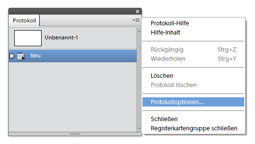 Das Menü des Protokollbedienfelds bietet einen "Protokoll-Optionen"-Menüpunkt, der die Protokollseite des ElementsXXL-Voreinstellungsdialogs anzeigt. Diese Optionen können verwendet werden, um das Verhalten des Protokollbedienfelds zu ändern. Für weitere Informationen lesen Sie bitte unter Voreinstellungen > ElementsXXL nach.