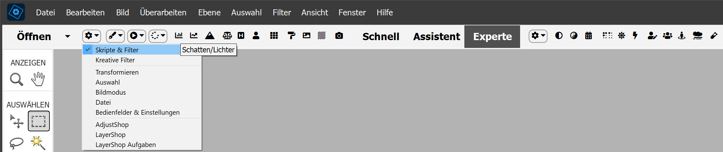Mit der Datei-Symbolleiste können Sie Dateien öffnen, neue Bilder erstellen, Ebenen in andere Dokumente kopieren sowie Dateien speichern, drucken und schließen. Die Symbolleiste "Bedienfelder & Einstellungen" bietet Symbole zum Ausführen verschiedener Bedienfelder und zum Anzeigen von Einstellungsdialogen. Die unteren Einträge funktionieren nur, wenn Sie auch die AdjustShop und LayerShop Plugins installiert haben. Falls ja, können Sie die nützlichsten Funktionen von AdjustShop und LayerShop schnell ausführen.