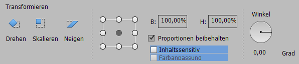 ElementsXXL fügt ebenso den WZ-Optionen des Transformieren-Werkzeugs das Kästchen "Inhaltssensitiv" hinzu, welches mit dem Tastaturkürzel Ctrl + T oder mit verschiedenen Menüpunkten in den Untermenüs "Drehen", "Transformieren" und "Skalieren" des Bildmenüs aufgerufen werden kann. Durch das Aktivieren des Kästchens Farbanpassung passt der inhaltssensitive Algorithmus die Farben an, somit wir praktisch einen anderer inhaltssensitiver Algorithmus verwendet. Diese Features funktionierten nur in in Photoshop Elements 13 und höher.
