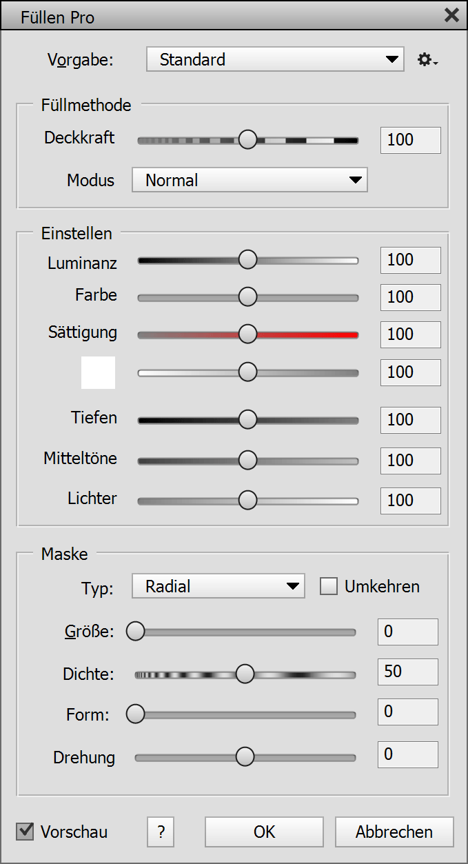 Die Optionen Linear und Radial nutzen einen linearen oder kreisförmigen Verläufen, um bestimmte Bildbereiche stufenweise durchscheinen zu lassen. Mit dem Abstand-Regler wird der lineare Verlauf nach oben oder unten bewegt, wodurch der Verlauf weniger oder mehr vom Bild abdeckt. Für die Radial-Option bewegt sich der kreisförmige Verlauf in Richtung Bildecken mittels Größe-Regler. Der Dichte-Regler steuert die Weichheit der Verlaufübergangs. Ein niedriger Reglerwert produziert eine harte Kante zwischen den Bildbereichen. Ein hoher Wert resultiert in einem sanften Übergang. Für die Radial-Option verfügen Sie über einen Form-Regler, der aus dem kreisförmigen einen elliptischen Verläufen macht. Schlussendlich dreht der Drehung-Regler den Verläufen. Er hat keinen Einfluss auf kreisförmige Verläufen, nur auf lineare und elliptische.