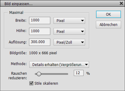 Wenn Ihr Dokument Ebenen mit Ebenenstilen enthält, lassen Sie das Kästchen Stile skalieren aktiviert, andernfalls werden die Stileffekte nicht in der Größe angepasst und erscheinen dadurch eventuell zu klein oder zu groß.