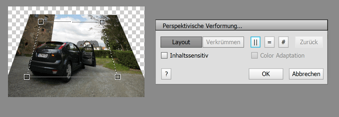 Perspektivische Verformung verbiegt das Bild perspektivisch. Es gibt zwei Modi. Zuerst müssen Sie ein Rechteck auf das Bild malen, was den Layout-Modus aktiviert. Ziehen Sie nun die vier Kontrollpunkte um dieses Quellrechteck zu modifizieren. Wenn das Bild perspektivisch falsch ist, sollten Sie das Quellrechteck so ändern, dass es den krummen Linien im Bild folgt. Wenn das Bild perspektivisch korrekt ist und Sie die das ändern möchten, lassen Sie am besten das Quellrechteck wie es ist.