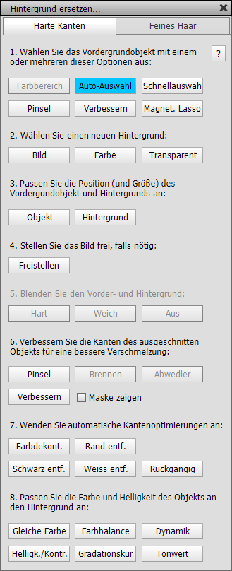 Ein Dialog mit einem Farbanpassung-Kästchen wird für diesen Befehl angezeigt.Das Farbanpassung-Kästchen teilt dem Inhaltssensitiv-Algorithmus mit, die Bildfarben zu justieren falls nötig. Manchmal sieht das Endergebnis dadurch besser oder aber auch schlechter aus.