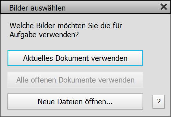 Wenn ein Dokument gefunden wird, wird das Dialogfeld "Bilder auswählen" angezeigt. Die Schaltfläche "Aktuelles Dokument verwenden" wendet die Aufgabe auf die Ebenen des aktuell aktiven Dokuments an. Die Schaltfläche "Alle geöffneten Dokumente verwenden" erstellt automatisch ein neues Dokument und fügt alle Dokumente als Ebenen ein, indem dee Befehl Dokumente als Ebenen platzieren verwendet wird. Die Schaltfläche "Neue Dateien öffnen" führt den Befehl Als Ebenen öffnen aus und zeigt einen Dateidialog zur Auswahl von Bilddateien an.