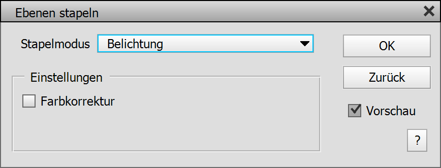 Der Menüpunkt "Optionen" zeigt den obigen Dialog an. Hier können Sie die Stapelmodi im Stapelmodus-Kombinationsfeld auswählen. Die Einstellungen-Gruppe zeigt Optionen zum Anpassen des Stapelmodus an. Der Belichtung-Stapelmodus bietet ein Kontrollkästchen für die Farbkorrektur zum Aktivieren einer Farbkorrekturfunktion. Im Median-Stapelmodus wird ein Kontrollkästchen Scharfzeichnen angezeigt, mit dem je nach den verwendeten Bildern ein Schärfeeffekt oder Artefakte hinzugefügt werden können. Abgesehen von zusätzlichen Optionen erleichtert das Optionen-Dialogfeld auch das Testen aller Stapelmodi, anstatt diese umständlich nacheinander im Ebenen-Stapeln-Untermenü auszuwählen. Probieren Sie die Cursortasten oben/unten aus, nachdem Sie das Kombinationsfeld ausgewählt haben, um schnell zwischen den Stapelmodi zu wechseln.