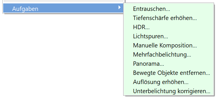 Das Aufgaben-Untermenü bietet sieben Punkte, um bestimmte Aufgaben nahezu automatisch ausführen zu können. Diese beginnen mit dem Öffnen eines oder mehrere Bilder und enden mit dem finalen Bildergebnis.