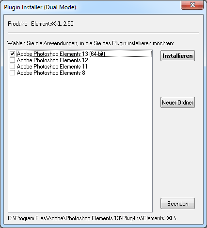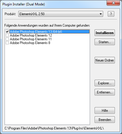 Wenn Sie eine neue Version von Photoshop Elements installieren und ElementsXXL bereits installiert ist, müssen Sie den kompletten ElementsXXL-Installationsvorgang nicht erneut durchführen. Sie können Plugin Installer vom Startmenü aus starten, um ElementsXXL in die neue Version von Photoshop Elements zu installieren.