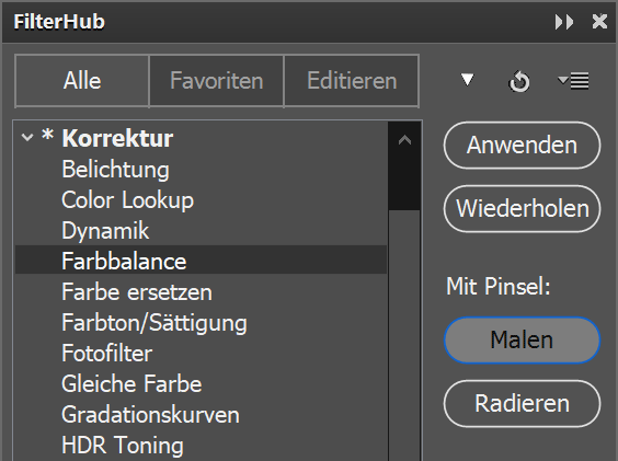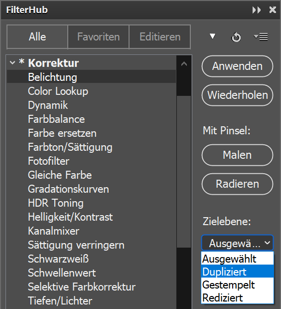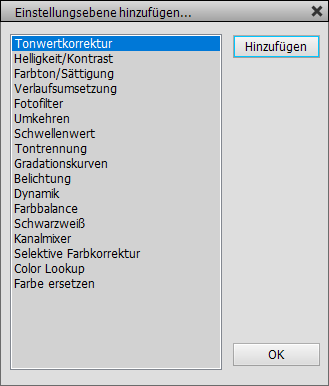 5. Falls Sie eine Einstellungsebene anwenden möchten, benutzen Sie den Befehl "Einstellungsebene hinzufügen". Doppelklicken Sie einen Listeneintrag, um diesen anzuwenden. Wenn Sie fertig sind, klicken Sie auf OK. Die hinzugefügten Einstellungsebenen werden im Ebenen-Bedienfeld angezeigt, wo auch deren Ebenenmaske angepasst werden kann. Bitte fügen Sie keine anderen Einstellungsebenen manuell hinzu, denn diese werden nicht mit dem finalen 16-bit Bild verrechnet. Sie können allerdings Füllebenen hinzufügen.