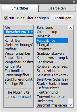 4. Falls Sie einen Filter auf eines der Smartobjekte anwenden möchten, wählen Sie den Befehl "Smartfilter hinzufügen" aus dem Rendern-Menü. Im erscheinenden Dialog werden Sie nur Filter sehen, die auch mit 16-bit Bildern funktionieren. Dies wird durch den "(16-bit)" Zusatz der Hinzufügen-Registerkarte angedeutet. Doppelklicken Sie einen Filter, um diesen anzuwenden. Wenn Sie zur Bearbeiten-Registerkarte wechseln, können Sie die angewandten Smartfilter wieder editieren. Beenden Sie den Dialog mit der OK-Schaltfläche. Falls Sie möchten, wenden Sie nun das Pinselwerkzeug, das Verlaufswerkzeug oder andere Werkzeuge an, um den Effekt der Smartfilter auf bestimmte Bildbereiche zu beschränken.