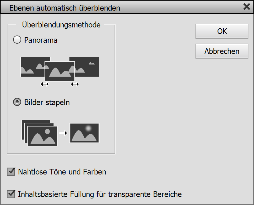 4. Wählen Sie Bilder stapeln aus den Überblendungsmethoden aus. Wenn gewünscht, aktivieren Sie das Kästchen für nahtlose Töne und Farben. Drücken Sie schließlich auf OK.