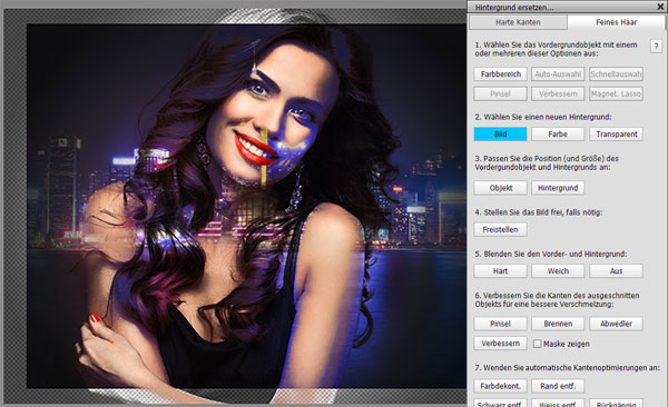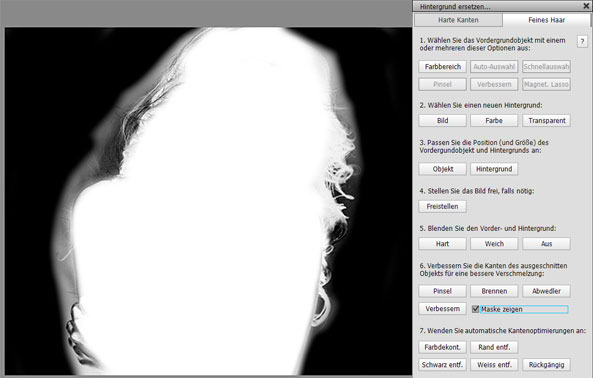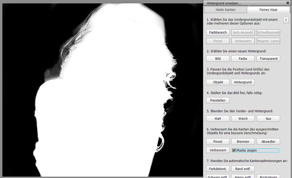 7. Die Maske wurde in eine Auswahl zurück verwandelt und Sie können jetzt die verfeinerte Auswahl mit Filtern und Werkzeugen bearbeiten.