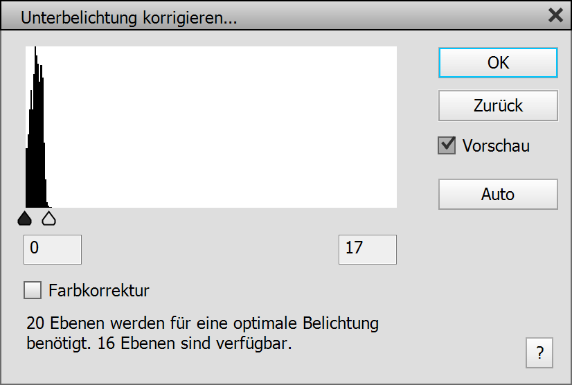 1. Schließen Sie alle Dokumente und wählen Sie Unterbelichtung korrigieren aus dem Bild > Aufgaben Untermenü oder aus dem Aufgaben-Bedienfeld, welches über das Fenster-Menü aufrufbar ist.