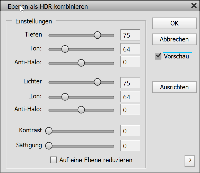 3. Wenn der Dialog "Ebenen als HDR kombinieren" erscheint, passen Sie für ein optimales Ergebnis dessen Einstellungen an. Dann klicken Sie auf OK.