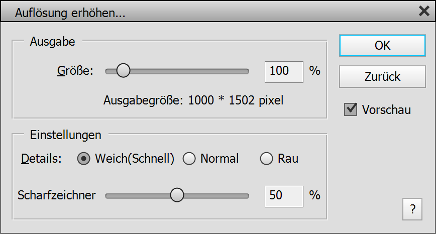 4. Wählen Sie Auflösung erhöhen aus dem Bild-Menü. Im erscheinenden Dialogfeld stellen Sie dann eine Ausgabegröße in Prozent ein, passen Sie die Einstellungen an und schärfen Sie nach Bedarf.