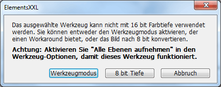 Wenn sie auf ein Werkzeug klicken, das normalerweise nicht mit 16-bit-Bildern nutzbar ist, zeigt ElementsXXL eine Nachricht wie folgt an: