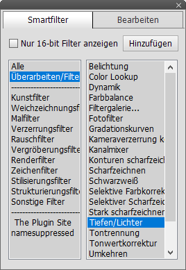 Auf der Smartfilter-Registerkarte des erschienenen Smartfilter-Bedienfeldes können Sie im linken Listenfeld zwischen Filtergruppen schalten und einen Filter im rechten Listenfeld wählen. Um einen Smartfilter anzuwenden klicken Sie entweder die Hinzufügen-Schaltfläche oder doppelklicken Sie einen Filter in der rechten Liste. Falls die aktuelle Ebene kein Smartobjekt ist, wird sie automatisch in ein solches konvertiert. Daraufhin erscheint der Filterdialog. Um nur Smartfilter anzuwenden, die auch 16-bit-pro-Kanal-Bilder unterstützen, können Sie das Kästchen "Nur 16-bit Filter anzeigen" aktivieren. Alternativ können Sie "Filter > In Smartobjekt konvertieren" wählen, um ein Smartobjekt zu erstellen und Smartfilter über Einträge des Filtermenüs auszuwählen.