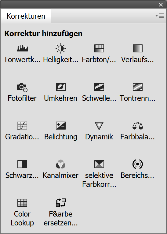 ElementsXXL zeigt auf dem Korrekturen-Bedienfeld von Photoshop Elements Icons an, solange keine Einstellungsebenen-Steuerelemente sichtbar sind. Sobald eine Einstellungsebenen im Ebenenbedienfeld ausgewählt ist, verschwinden die Icons und machen Platz für Bedienelemente der Einstellungsebene. Nach dem Anwählen einer nicht-Einstellungsebene erscheinen die Icons wieder.