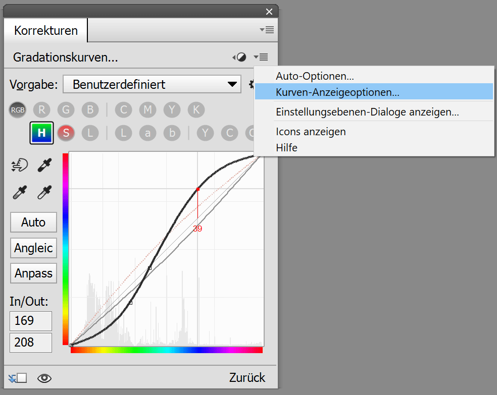 Alle Steuerelemente der ElementsXXL-Einstellungsebenen, die im Korrekturen-Bedienfeld angezeigt werden, haben oben rechts zwei Symbole. Das erste Symbol mit dem Zurückpfeil lässt die aktuellen Steuerelemente verschwinden und zeigt die Symbole zum erneuten Hinzufügen neuer Einstellungsebenen an. Auf diese Weise müssen Sie nicht auf eine Bildebene klicken, um die Symbole erneut anzuzeigen. Das zweite Menüsymbol zeigt ein Menü mit verschiedenen Elementen an. Der Menüpunkt Auto-Optionen der Gradationskurven-Einstellungsebene zeigt das Dialogfeld Auto-Optionen an. Das Menüelement Kurven-Anzeigeoptionen ermöglicht das Anpassen des Erscheinungsbilds des Kurvendiagramms. Die folgenden Menüelemente sind für alle ElementsXXL-Einstellungsebenen verfügbar: Mit dem Menüpunkt Einstellungsebenen-Dialoge anzeigen können Sie die gleichnamige ElementsXXL-Voreinstellungen-Funktion aktivieren, mit der die Steuerelemente für Einstellungsebenen in einem eigenen Dialogfeld und nicht im Korrekturen-Bedienfeld selbst angezeigt werden. Dies kann in den ElementsXXL-Voreinstellungen wieder rückgängig gemacht werden. Der Punkt Icons anzeigen hat den gleichen Zweck wie das erste Symbol und zeigt die Icons aller Einstellungsebenen erneut an. Der Hilfe-Menüpunkt zeigt die entsprechende Stelle im Handbuch an, ähnlich wie die ?-Schaltfläche in vielen Dialogen.