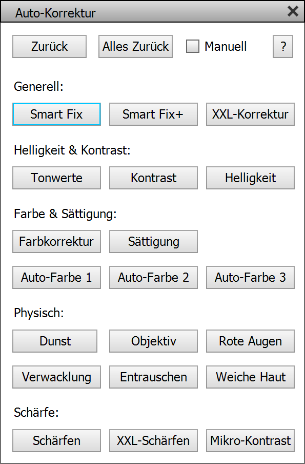 Die beiden Smart Fix-Schaltflächen wenden mehrere Korrekturen gleichzeitig an. XXL-Korrektur macht etwas Ähnliches, wird aber von ElementsXXL selbst durchgeführt. Die Schaltflächen Tonwerte, Kontrast und Helligkeit versuchen, den Schwarz- und Weiß-Punkt, den Kontrast oder die Helligkeit des aktuellen Bildes zu verbessern.