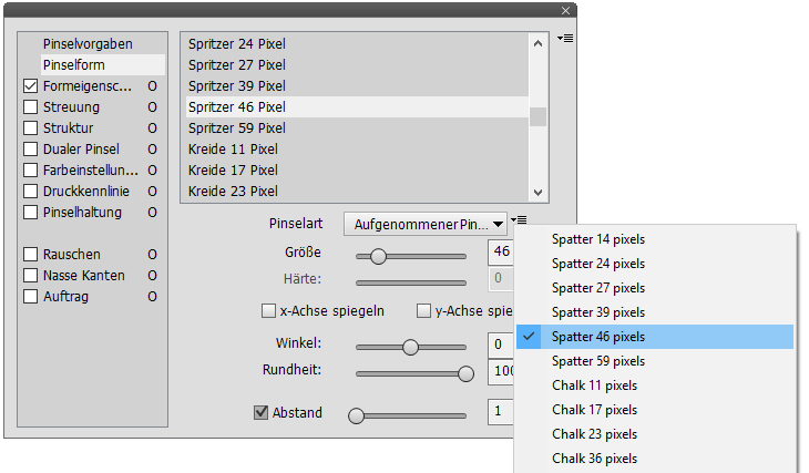 Der Pinselform-Eintrag zeigt Steuerelemente zum Anpassen der Pinselform an. Die Liste links oben ermöglicht das Ändern der Pinselform, indem eine Pinselvorgabe ausgewählt wird. Im Gegensatz zur Liste unter Pinselvorgaben führt das Klicken auf einen Listeneintrag lediglich dazu, dass die Pinselform-Steuerelemente aktualisiert werden und nicht alle Steuerelemente des Pinsel-Bedienfeldes.