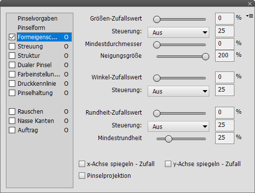 Der Regler "Rundheit-Zufallswert" legt fest, wie stark die Rundheit der Pinselform zufällig variiert. Das Kombinationsfeld "Steuerung" definiert, ob die Rundheitsvariation aus- bzw. eingeschaltet ist, ob sie über den zeitlichen Verlauf verblasst oder vom Zeichenstiftdruck, von der Zeichenstiftschrägstellung, vom Stylus-Rad oder der Stylus-Drehung eines Grafiktabletts gesteuert wird. Wenn Sie die Option "Verblassen" ausgewählt haben, können Sie auch einen Wert zwischen 1 und 9999 eingeben, um die Dauer des Verblassens festzulegen. Der Regler "Mindestrundheit" definiert das Minimum an Rundheit, das die Pinselform haben kann. Die Kästchen "x-Achse spiegeln - Zufall" und "y-Achse spiegeln - Zufall" spiegeln die Pinselform zufällig und das Kästchen "Pinselprojektion" erlaubt die Projektion der Pinselform.