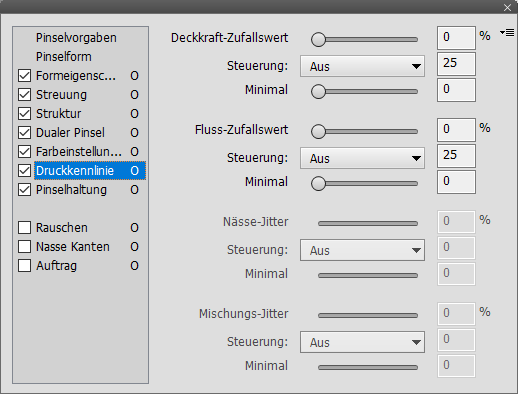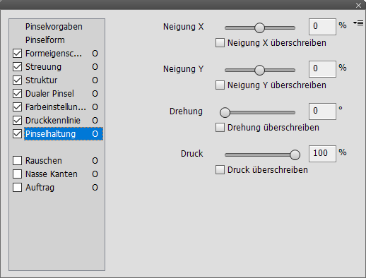 Das Pinsel-Bedienfeld bietet auf der linken Seite eine Liste, die ähnlich wie Registerschaltflächen funktionieren. Ein Klick auf jeden der Listeneinträge zeigt neue Steuerelemente an und aktiviert ebenso das Kästchen jeden Eintrags (mit Ausnahme der ersten beiden Einträge). Sie können die Einstellungen der Steuerelemente deaktivieren, indem Sie das entsprechende Kästchen des Listeneintrags deaktivieren. Der Buchstabe "O" auf der rechten Seite jedes Listeneintrags bedeutet, dass dessen Einstellungen offen und nicht gesperrt sind. Daher können sie überschrieben werden, wenn auf eine Pinselvorgabe geklickt wird. Wenn Sie auf das "O" klicken, ändert es sich zu einem durchgestrichenen "Ø"-Zeichen, was bedeutet, dass die Einstellungen gesperrt sind und nicht durch eine Pinselvorgabe verändert werden.