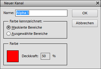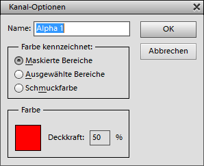 Der Menüpunkt Maskenoptionen des Bedienfeldmenüs zeigt einen Dialog zum Auswählen der Farbe und Deckkraft an, die dazu genutzt werden, die Ebenen- oder Filtermaske zusammen mit dem Bild anzuzeigen. Er ist identisch mit dem Befehl Kanaloptionen im Kanäle-Bedienfeld.