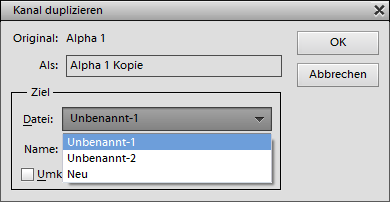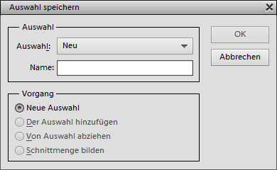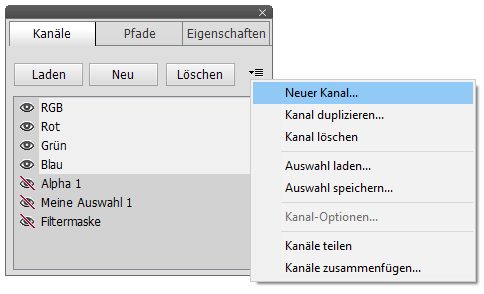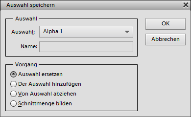 Der Menüpunkt Auswahl speichern im Bedienfeldmenü (ebenso wie Auswahl > Auswahl speichern) erlaubt es Ihnen, die aktuelle Auswahl als Kanal zu speichern, sowie einen bereits existierenden Alphakanal mit Hilfe der Auswahl zu verändern. Um die Auswahl als einen neuen Kanal zu speichern, behalten Sie den Punkt "Neu" im Auswahl-Kombinationsfeld bei und geben Sie den Namen des Kanals darunter ein.