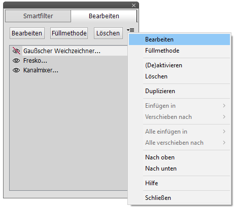 Doppelklicken Sie auf einen Smartfilter, um dessen Einstellungen zu bearbeiten oder wählen Sie ihn aus und klicken die Bearbeiten-Schaltfläche. Die Füllmethode-Schaltfläche zeigt einen Dialog zum Anpassen der Füllmethode und Deckkraft des Smartfilters an. Die Löschen-Schaltfläche entfernt den ausgewählten Smartfilter. Um einen aktivierten Smartfilter zu deaktivieren klicken Sie auf dessen Auge-Icon, welches dadurch durchgestrichen wird. Um ihn wieder zu aktivieren, klicken Sie das Auge erneut. Sie können diese vier Dinge auch mit den obersten Menüpunkten des Bedienfeld-Menüs durchführen.