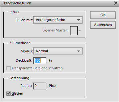Der Pfadfläche füllen Dialog bietet verschiedene Einstellungen. Sie können eine Farbe, die Füllmethode, Deckkraft, Weichheit und Glättung der Fülloperation bestimmen.