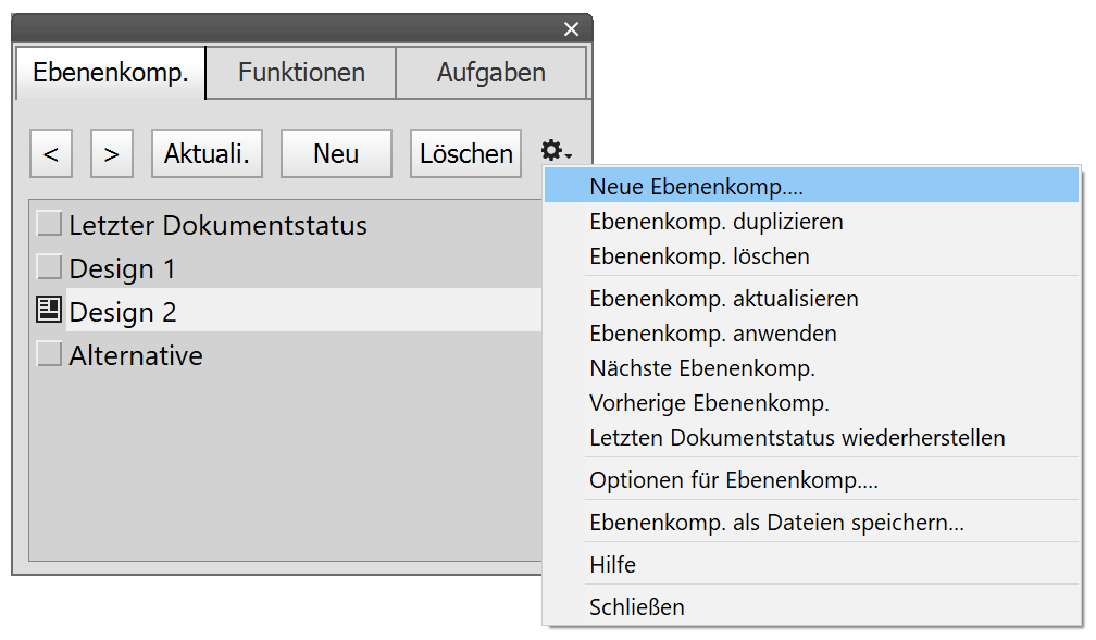 Die existierenden Ebenenkompositionen werden in der Liste des Ebenenkomp.-Bedienfeld angezeigt. Darüber befinden sich fünf Schaltflächen sowie ein Menüsymbol, das ein weiteres Menü mit zusätzlichen Befehlen anzeigt. Sie können das selbe Menü auch als Kontextmenü anzeigen, indem Sie auf einen der Ebenenkompositionspunkte in der Listenleiste rechts klicken.