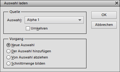 Um einen bereits existierenden Kanal mit einer Auswahl zu verändern, wählen Sie den Kanalnamen aus dem Auswahl-Kombinationsfeld. Jetzt werden die drei ausgegrauten Schaltknöpfe unten besser sichtbar und das Optionsfeld "Neue Auswahl" wird umbenannt in "Auswahl ersetzen". Wie Sie bereits vermutet haben, ersetzt die Option Auswahl ersetzen einfach den existierenden Kanal durch die Auswahl. Die Option Der Auswahl hinzufügen erweitert die ausgewählten Bereiche des Kanals um die Auswahl. Die Option Von Auswahl abziehen verkleinert diese und die Option Schnittmenge bilden behält lediglich die Schnittmenge des Kanals und der Auswahl bei.