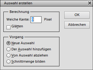 Der Auswahl erstellen Befehl produziert eine Auswahl mittels des aktuellen Pfades und erlaubt es auch, die aktuelle Auswahl mit dem Pfad zu kombinieren. Außerdem können Sie eine weiche Kante hinzufügen und die Auswahl glätten. Die Option Neue Auswahl ersetzt einfach die existierenden Auswahl durch die Auswahl, die mittels des Pfad erzeugt wird. Die Option Der Auswahl hinzufügen addiert den Pfad zur Auswahl. Die Option Von Auswahl abziehen verkleinert diese und die Option Schnittmenge bilden behält lediglich die Schnittmenge des Pfades und der Auswahl bei.