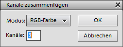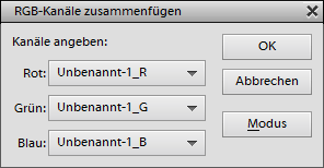Der Menüpunkt Kanäle zusammenfügen zeigt zwei Dialoge in Folge. Im ersten wählen Sie bitte “RGB-Farbe” aus dem Modus-Kombinationsfeld. Die anderen Optionen machen nicht viel Sinn. Bitte gehen Sie ebenso sicher, dass Kanäle auf 3 gesetzt ist. Nachdem Sie auf OK geklickt haben, müssen Sie im neuen Dialog die Dokumentnamen angeben, die den roten, grünen und blauen Kanal enthalten. Normalerweise sind diese bereits automatisch ausgewählt, so dass sie lediglich auf OK klicken müssen. Nun werden die drei Graustufenbilder zu einem neuen RGB-Dokument vereint.