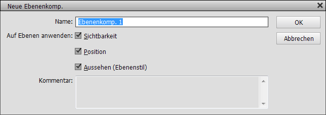 Im erscheinenden Dialog können Sie einen Namen für die Ebenenkomposition eingeben und entscheiden, welche Ebeneneigenschaften angewendet werden sollen. Wenn Sie sich unsicher sind, lassen Sie alle drei Kästchen aktiviert. Wenn Sie möchten, können Sie auch einen Kommentar hinzufügen, um diese Ebenenkomposition zu erklären. Nachdem Sie auf OK geklickt haben, sehen Sie die neue Ebenenkomposition in der Liste des Ebenenkomp.-Bedienfeldes.