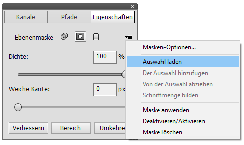 Die Verbessern-Schaltfläche zeigt den Dialog "Kanten verbessern" an (ebenso im Auswahlmenü verfügbar), um die Maske anzupassen. Die Bereich-Schaltfläche zeigt den Farbbereich an (auch im Auswahlmenü verfügbar), um die Maske neu zu erstellen. Die Umkehren-Schaltfläche kehrt einfach die Maske um, so dass die ausgewählten Bereiche maskiert sind und umgekehrt.