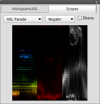 Das Scopes-Bedienfeld zeigt 23 verschiedene Arten von Scope (wählbar aus dem erstes Kombinationsfeld) in negativem oder positivem Stil (zweites Kombinationsfeld). Nur die Farbmodelle RGB, CMYK, HSL und YCbCr werden zum Berechnen der Scopes verwendet. Es steht kein Lab-Scope (siehe HistogramsXXL-Bedienfeld) zur Verfügung, da dessen Berechnung zu zeitaufwändig wäre und das YCbCr-Farbmodel ein sehr ähnliches Scope bietet.