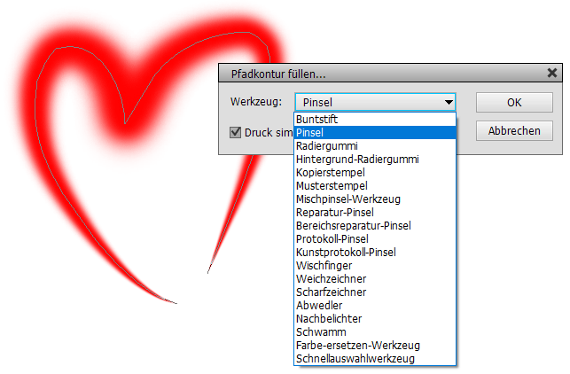Der Pfadkontur füllen Dialog erlaubt es, das verwendete Werkzeug auszuwählen sowie das Druck simulieren Kästchen für einen schwungvolleren Effekt zu aktivieren. Die Kontur wird aufgrund der aktuellen Einstellungen des gewählten Werkzeugs gezeichnet. Bevor Sie also den Pfadkontur füllen Befehl ausführen, ist es sinnvoll, das Werkzeug, das sie verwenden wollen, auszuwählen und dessen Einstellungen auf der WZ-Optionen-Leiste anzupassen, um das gewünschte Ergebnis zu erzielen.