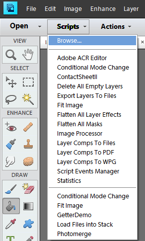 ElementsXXL makes Scripts, Actions and Render drop-down buttons available in Photoshop Elements 8 and higher for quickly accessing scripts, actions and the Render commands.
