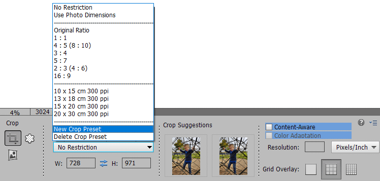 Crop presets as well as Content-Aware, Color Adaptation and Delete Cropped Pixels options for the Crop tool in Photoshop Elements 13 and higher.