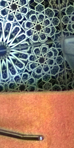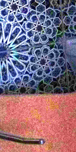 At the left is a section of 1 of 16 underexposed photos. In the middle one of the photos was treated with Photoshop's Levels feature. The noise was amplified a lot and there is a blue color cast. The image on the right was produced with LayerShop's Fix Underexposure feature. It contains very little noise although the photos were taken with ISO 3200, small details are more clearly visible and the blue color cast was automatically fixed.