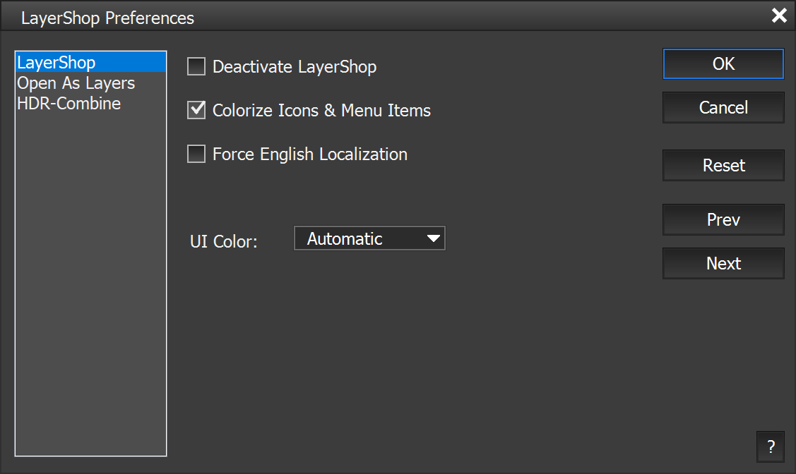 If you click on this menu item on the Preferences sub menu, a dialog window is opened that lets you change the settings of LayerShop. You can switch between different preferences groups by using the list on the left-hand side or by clicking the Prev and Next buttons. To set all options to the original default values click the Reset button. Press OK to apply the changes on this dialog or Cancel to discard them.