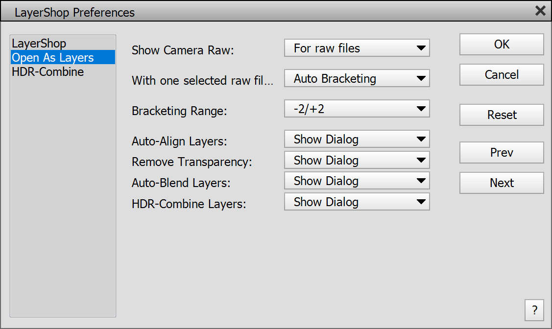 The With one selected raw file combo box defines what is done if only one file is selected on the Open As Layers dialog. The No Bracketing option simply opens only one file. The Auto Bracketing option shows the Camera Raw dialog only once and then automatically creates two additional exposure variations, whose exposure difference depends on the Bracketing Range combo box. The Manual Bracketing option displays the Camera Raw dialog three times: The first time with normal exposure, the second time with under exposure and the third time with overexposure. In each case you can manually adjust the Camera Raw settings. Please note that Manual Bracketing overrides the Never setting of the Show Camera Raw option.